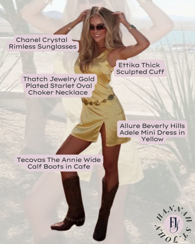 The soft yellow mini brings that flirty, pop-inspired vibe, while the western boots ground the outfit and make it feel Coachella-ready instead of overly polished. It’s the contrast that makes it land so well, sweet and structured up top, a little undone and effortless on the bottom, creating a look that feels fun, current, and perfectly in tune with festival style.